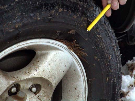 How'd that happen? Eric ran his 16" Grabbers against a tree root and ripped off what was left. Luckilly he didn't loose any tire pressure, and was able to remove the root later on in the trail.